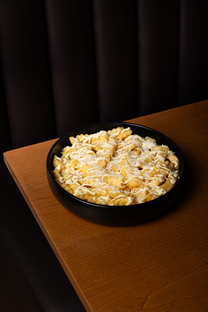 Batatas crocantes com maionese trufada e parmesão ralado. Um toque gourmet numa combinação irresistível